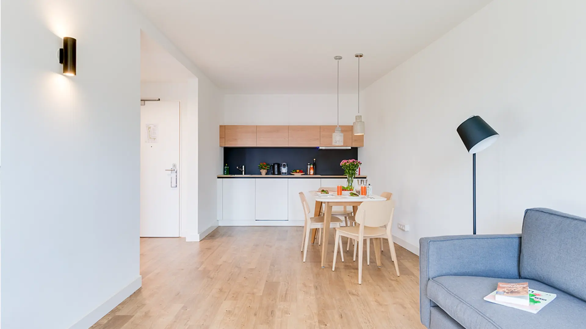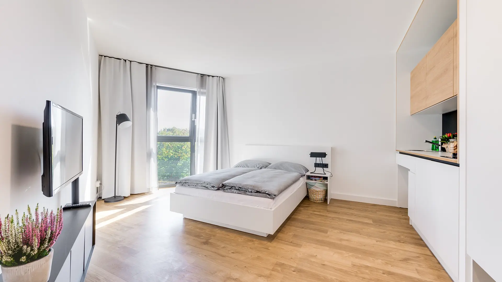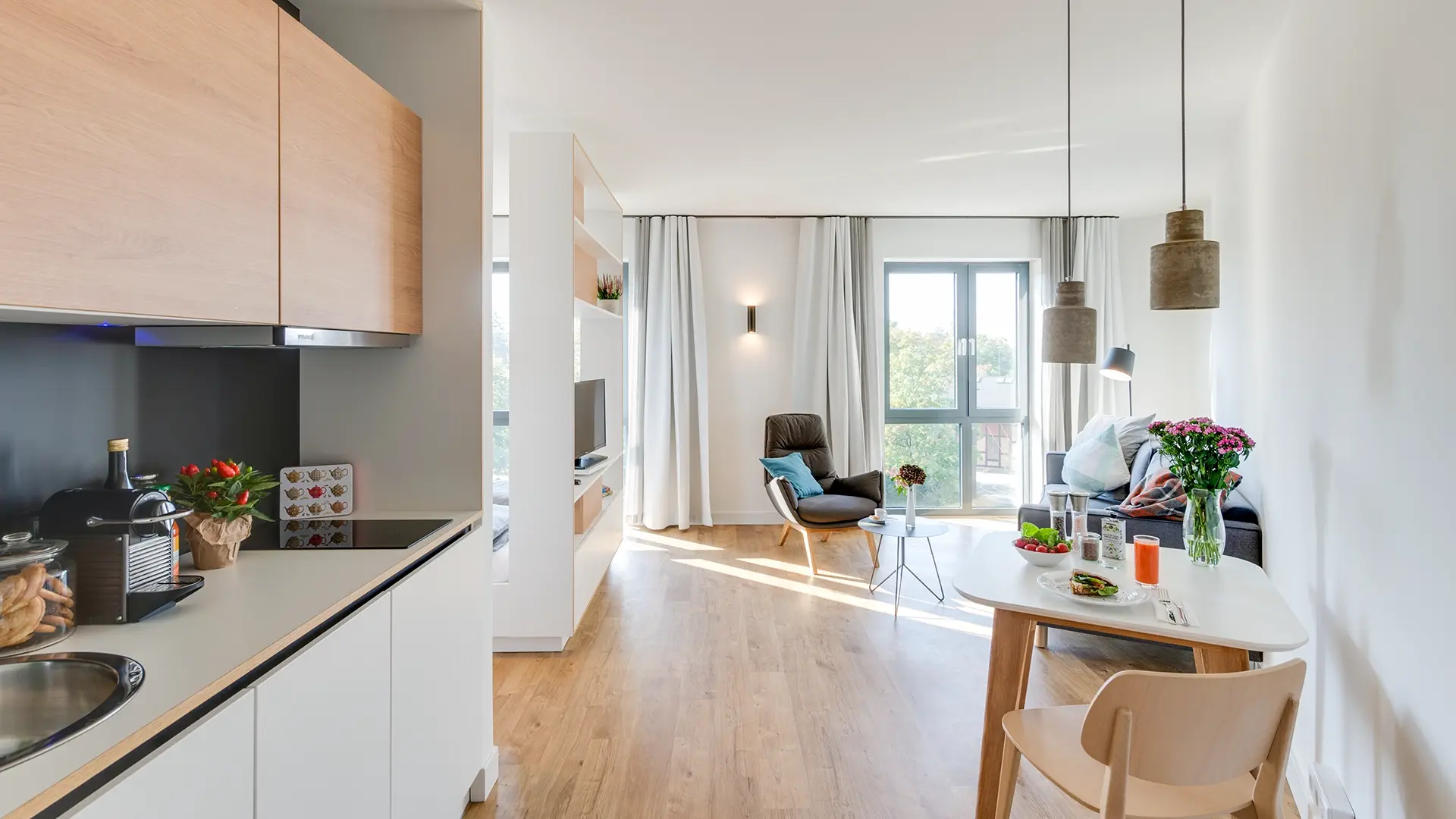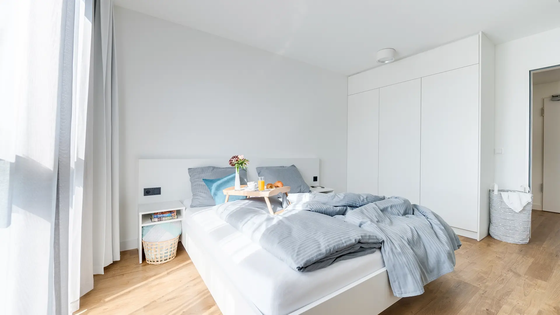 A serviced apartment is a furnished apartment with its own kitchenette. You can book it flexibly for short or longer periods – from one night up to 6 months. Learn more.