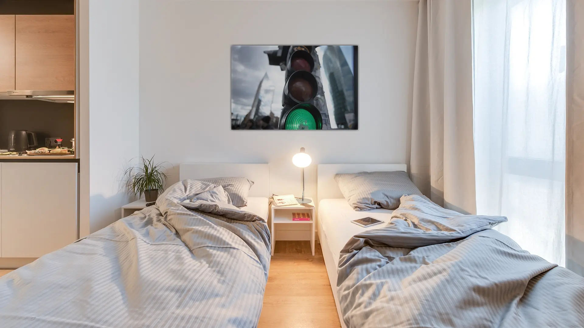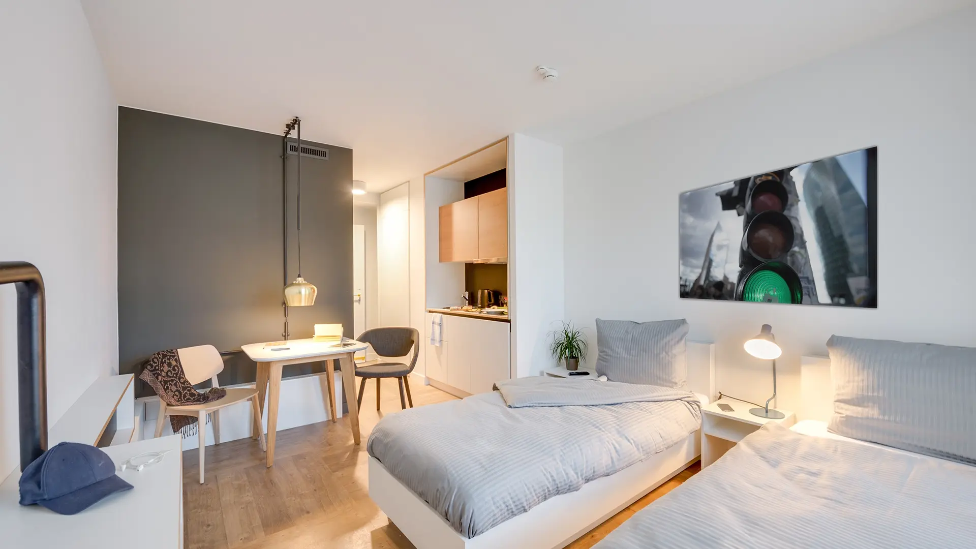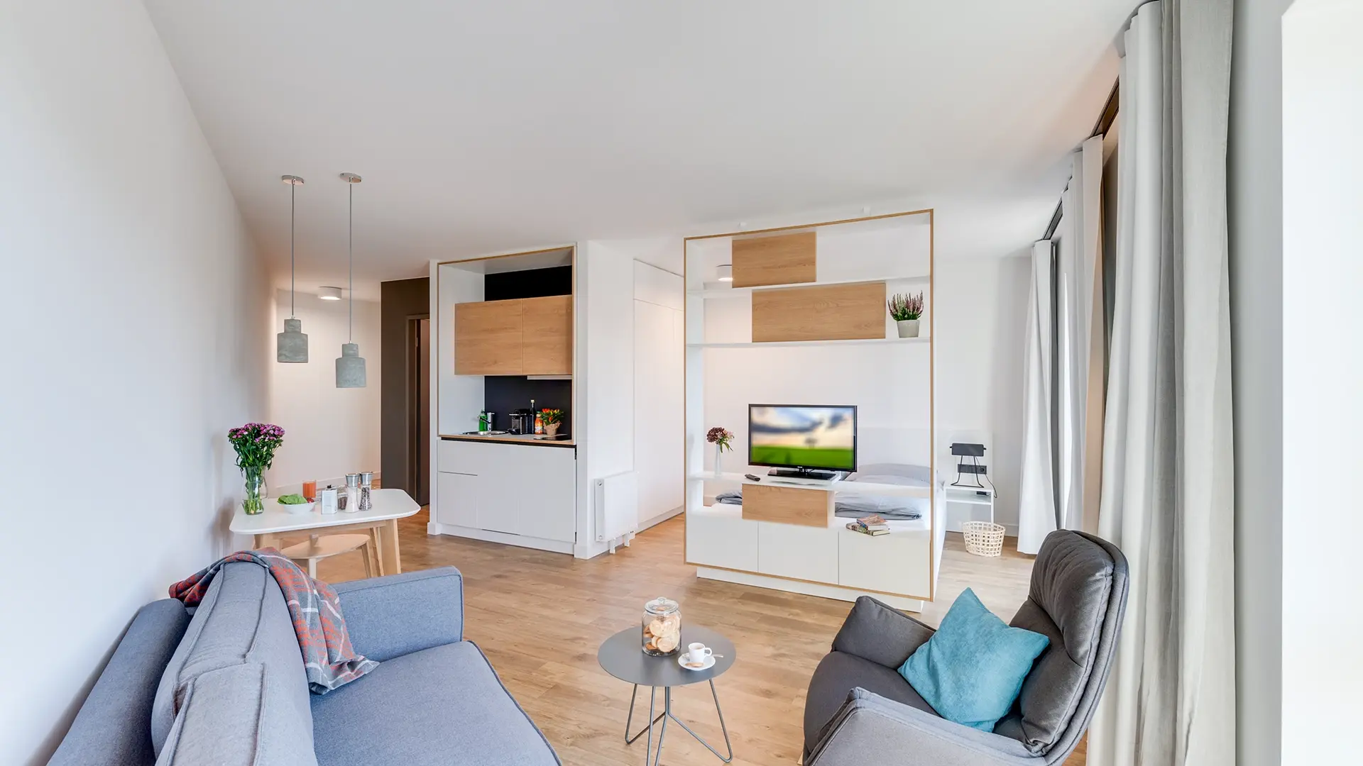 A serviced apartment is a furnished apartment with its own kitchenette. You can book it flexibly for short or longer periods – from one night up to 6 months. Learn more.