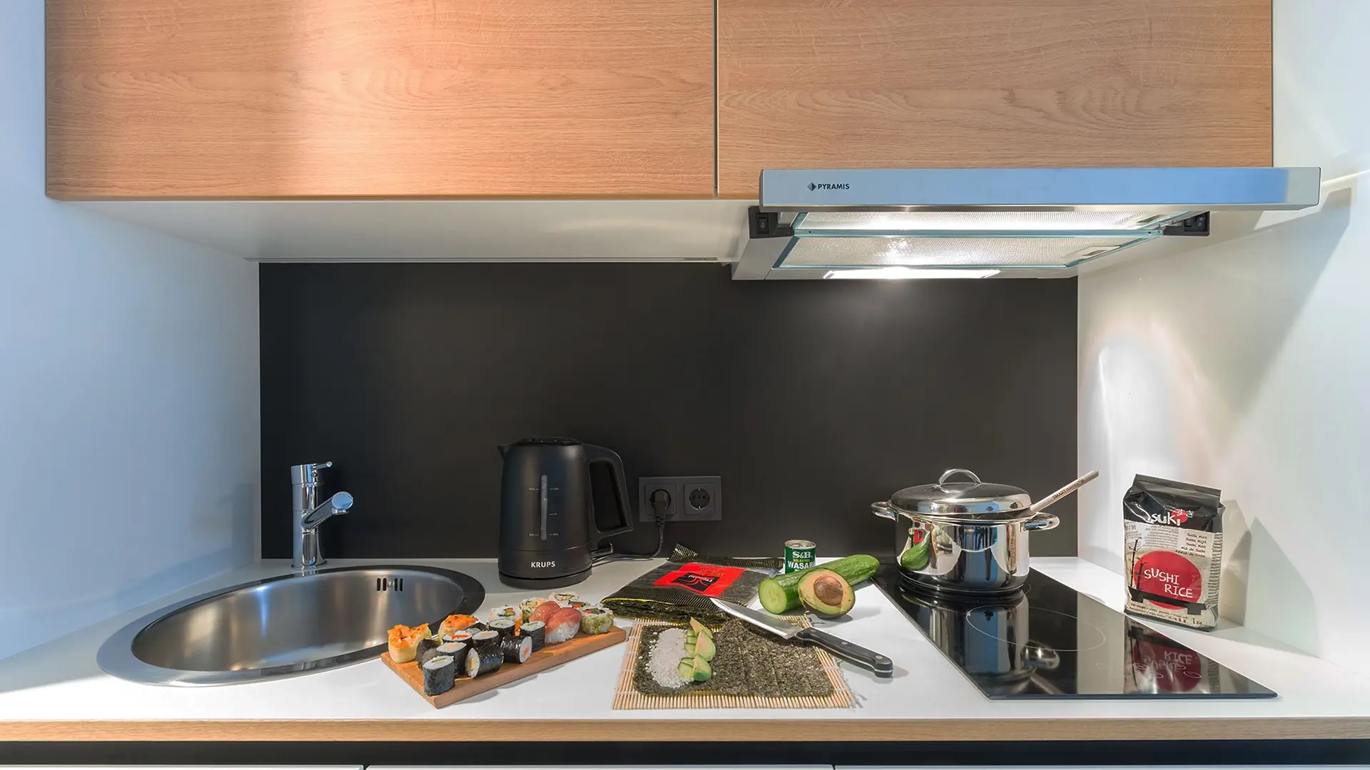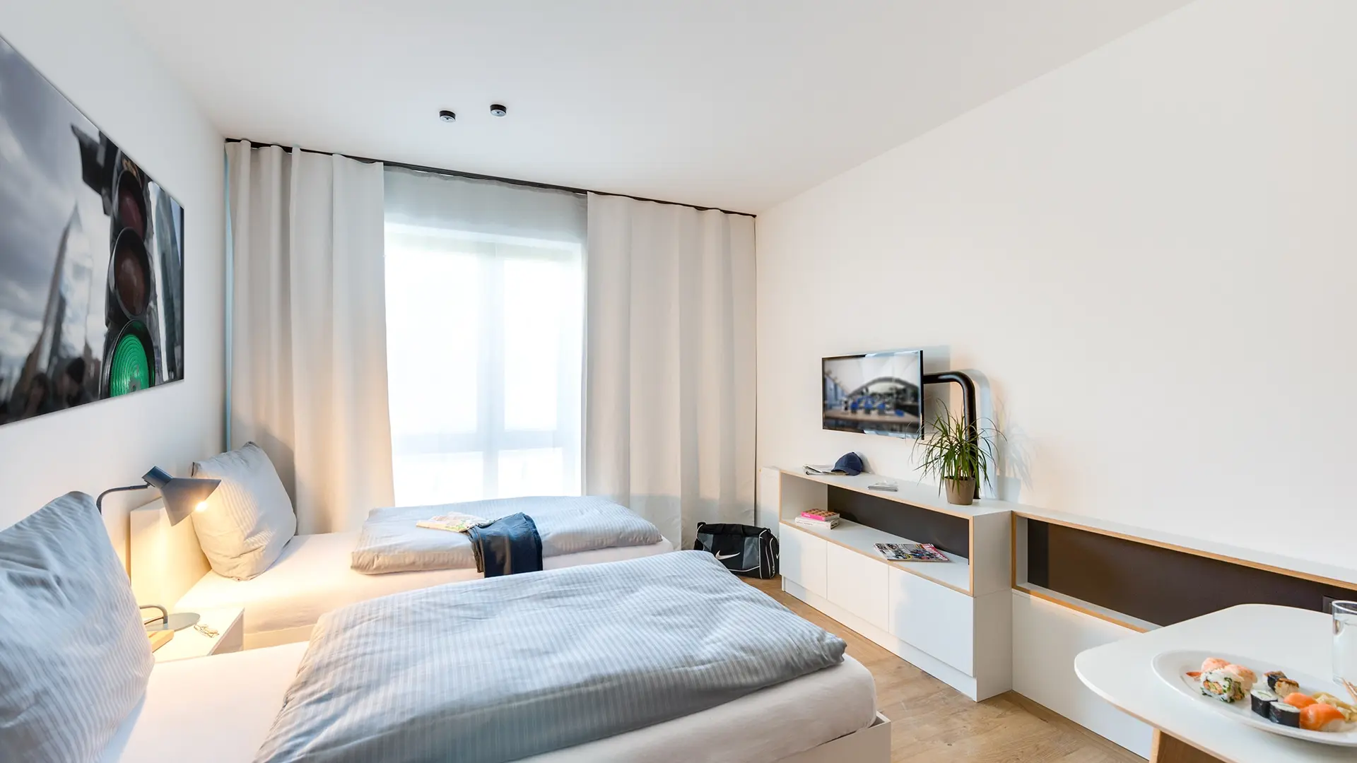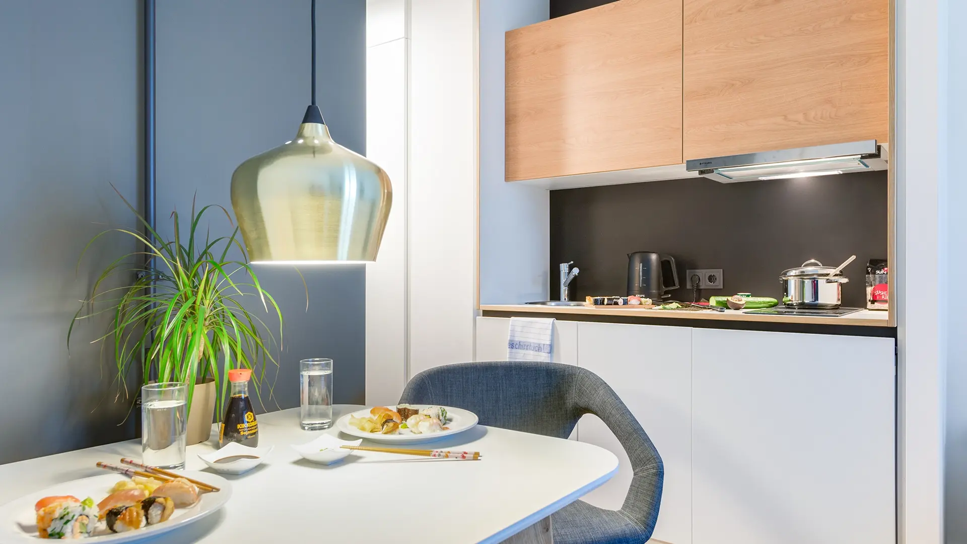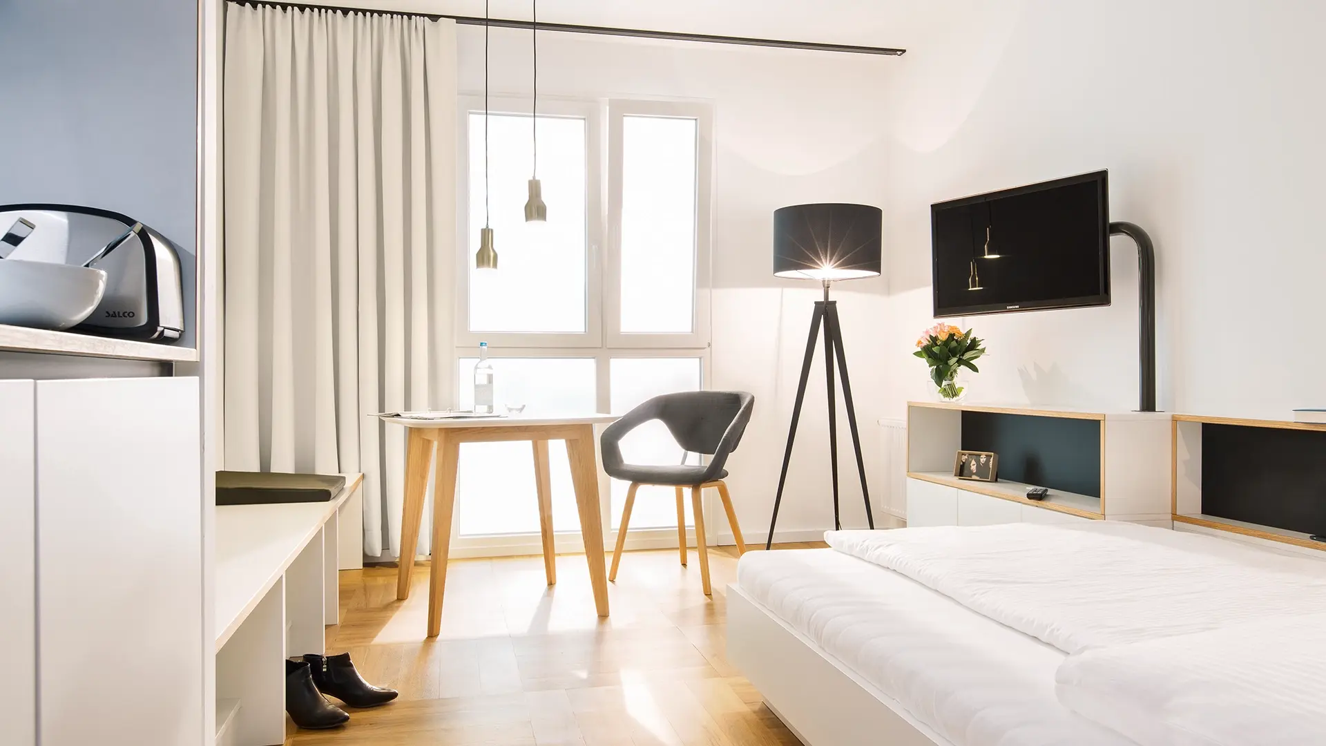 A serviced apartment is a furnished apartment with its own kitchenette. You can book it flexibly for short or longer periods – from one night up to 6 months. Learn more.