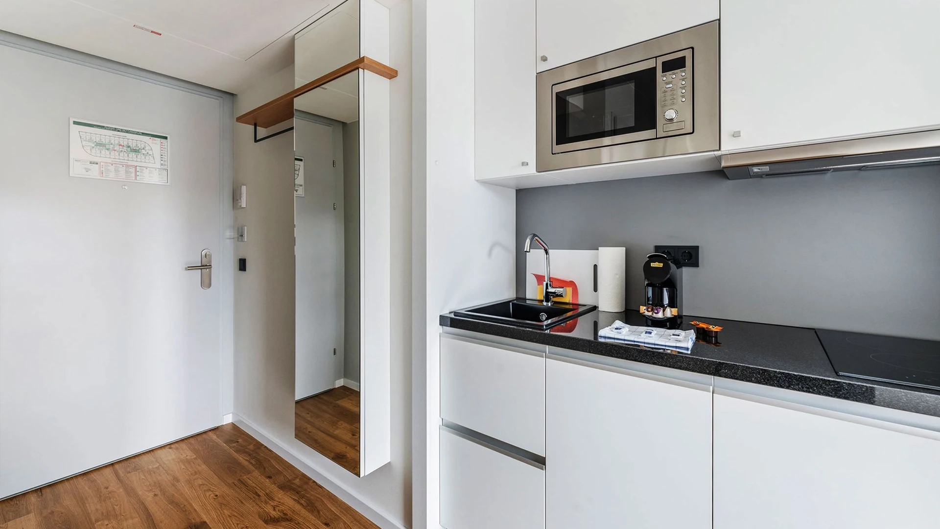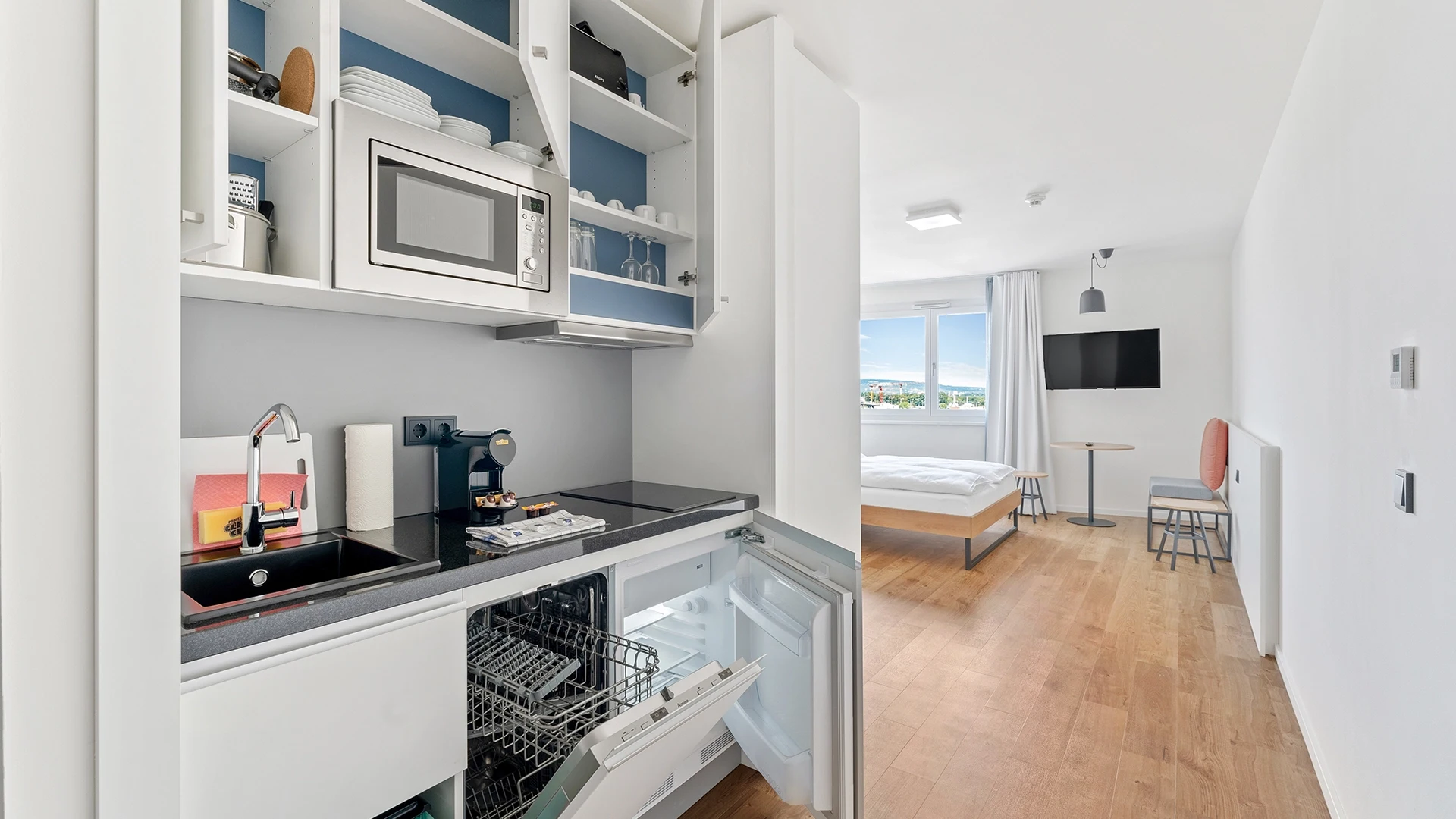 A serviced apartment is a furnished apartment with its own kitchenette. You can book it flexibly for short or longer periods – from one night up to 6 months. Learn more.